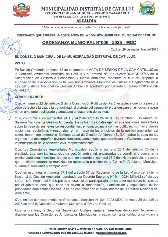 ORDENANZA MUNICIPAL QUE APRUEBA LA ADECUACIÓN DE LA COMISION AMBIENTAL MUNICIPAL (CAM) DE LA MUNICIPALIDAD DISTRITAL DE CATILLUC DE LA PROVINCIA DE SAN MIGUEL