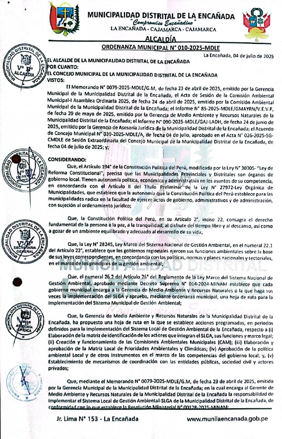 ORDENANZA MUNICIPAL QUE APRUEBA EL PROCESO DE IMPLEMENTACIÓN DEL SISTEMA REGIONAL DE GESTION AMBIENTAL DEL DISTRITO DE LA ENCAÑADA -CAJAMARCA Y LA HOJA DE RUTA
