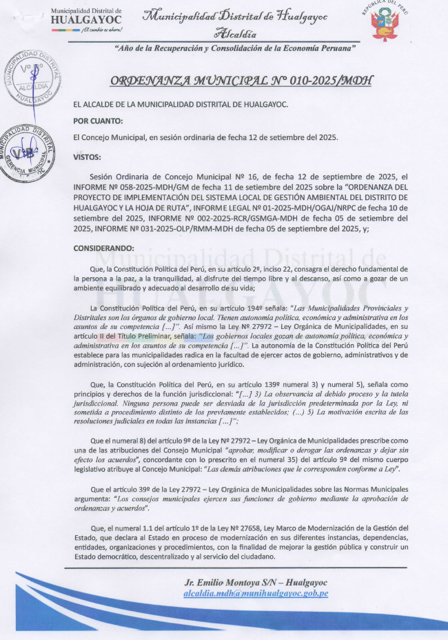 ORDENANZA MUNICIPAL QUE APRUEBA EL PROCESO DE IMPLEMENTACIÓN DEL SISTEMA REGIONAL DE GESTION AMBIENTAL DEL DISTRITO DE HUALGAYOC -HUALGAYOC Y LA HOJA DE RUTA