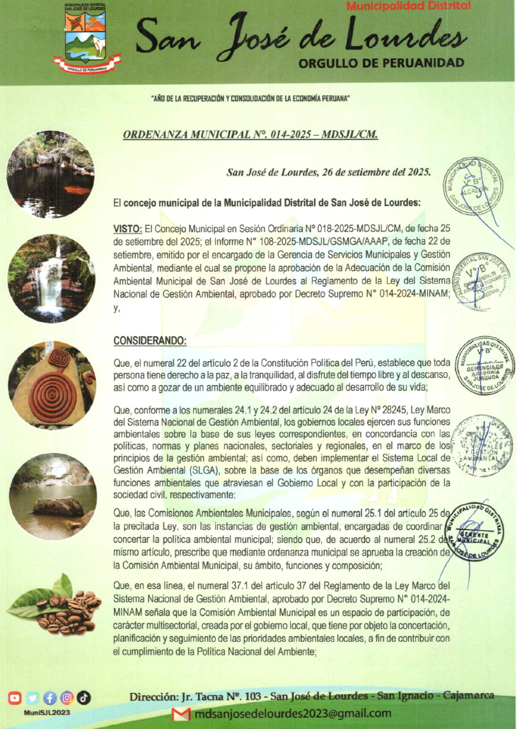 ORDENANZA MUNICIPAL QUE APRUEBA LA ADECUACIÓN DE LA COMISION AMBIENTAL MUNICIPAL (CAM) DEL DISTRITO DE SAN JOSE DE LOURDES DE LA PROVINCIA DE SAN IGNACIO