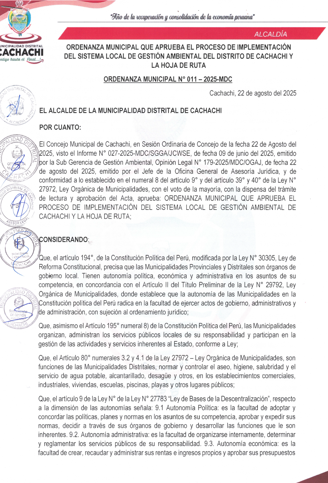 ORDENANZA MUNICIPAL QUE APRUEBA EL PROCESO DE IMPLEMENTACIÓN DEL SISTEMA REGIONAL DE GESTION AMBIENTAL DEL DISTRITO DE CACHACHI -CAJABAMBA Y LA HOJA DE RUTA