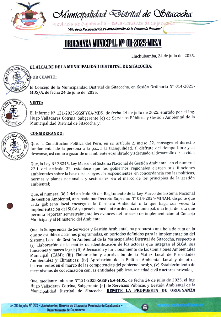 ORDENANZA MUNICIPAL QUE APRUEBA EL PROCESO DE IMPLEMENTACIÓN DEL SISTEMA REGIONAL DE GESTION AMBIENTAL DEL DISTRITO DE SITACOCHA -CAJABAMBA Y LA HOJA DE RUTA