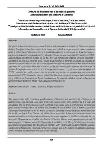 Se registró la diversidad alfa o riqueza específica de la avifauna urbana de la ciudad de Cajamarca, al norte de Perú. Se eligieron cinco área de estudio las cuales fueron clasificadas por su tamaño e importancia; se utilizó la metodología de búsqueda intensiva modificada utilizando un solo censo por lugar de muestreo, con tres repeticiones en los periodos seco y húmedo cada uno durante marzo del 2019 a marzo del 2020; cada muestreo tuvo tiempo variable de 30, 60, 90 y 120 minutos dependiendo del área estudiada y actividad de la avifauna, iniciando a las 7 horas de la mañana; se tomaron en cuenta los registros de encuentros ocasionales en el área urbana y se utilizaron las observaciones históricas del equipo evaluador registrado en la plataforma Ebird para la ciudad. Se lograron identificar 82 especies, distribuidas en 28 familias. Se registró una especie endémica, 13 emigrantes boreales, 13 que forman parte del Apéndice II CITES , además de identificar que todas las especies registradas se encuentran en el estatus de conservación “LC” (Preocupación Menor) de la IUCN. El área que presentó la mayor riqueza específica fue la ex Planta de Tratamiento de Aguas Residuales con 77 especies, debido a que allí se formado un humedal artificial que brinda refugio y alimento para muchas especies.
