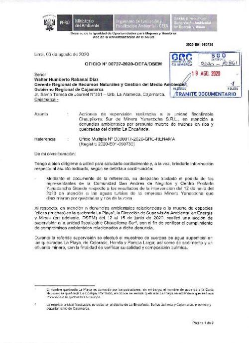 Supervisión Chaupiloma Sur de Minera Yanacocha S.R.L - presunta muerte de truchas en rios y quebradas del distrito La Encañada
