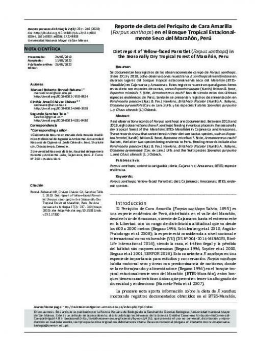 Reporte de dieta del Periquito de Cara Amarilla (Forpus xanthops) en el Bosque Tropical Estacionalmente Seco del Marañón, Perú