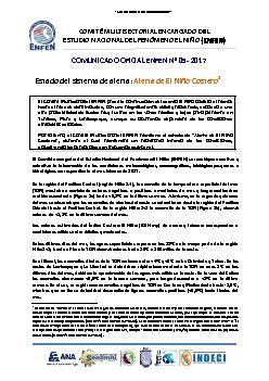El Comité Multisectorial del Estudio Nacional del Fenómeno del Niño (ENFEN), prevé la continuación del evento El Niño costero al menos hasta el mes de abril inclusive, con una magnitud entre débil y moderada, asociado a una alta probabilidad de lluvias muy fuertes en las zonas medias y bajas principalmente en Tumbes, Piura y Lambayeque, aunque su ocurrencia dependerá de las condiciones atmosféricas locales. Por lo tanto, el Comité Multisectorial ENFEN mantiene el estado de “Alerta de El Niño Costero”, durante el cual mantendrá un monitoreo intenso de las condiciones, actualizando las perspectivas en frecuencia quincenal.
