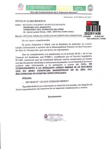 DENUNCIAS AMBIENTALES EN EL AÑO 2021 - MUNICIPALIDAD DISTRITAL DE SAN FRANCISCO DE ASIS DE YARUSYACAN - PASCO