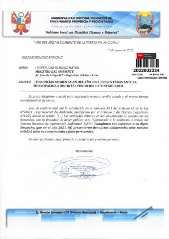 Denuncias ambientales del año 2021 presentadas ante la Municipalidad Distrital Fundición de Tinyahuarco