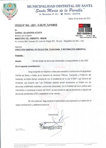 Denuncias ambientales correspondientes al año 2020 de la Municipalidad Distrital de Santa