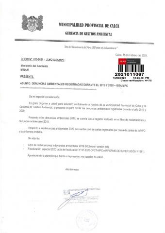 Denuncias ambientales correspondientes al año 2020 de la Municipalidad Provincial de Calca