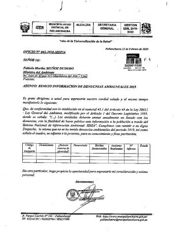 Denuncias ambientales del periodo 2019 Municipalidad Distrital de Pallanchacra