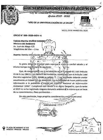 Información de denuncias 2019 Municipalidad Distrital de Vicco