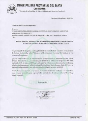 Información de denuncias ambientales 2019 atendidas por la Municipalidad Provincial del Santa