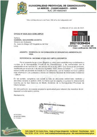 Información de denuncias ambientales 2020 de la Municipalidad provincial de Chanchamayo