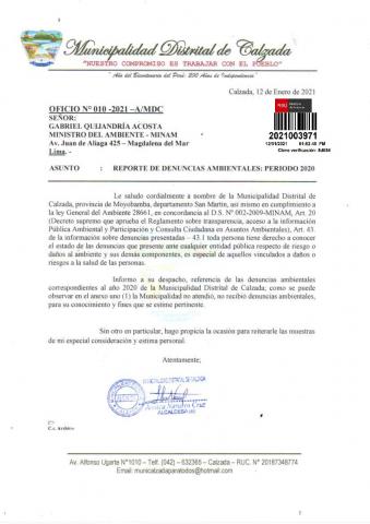 Información de denuncias ambientales del año 2020 de la Municipalidad Distrital de Calzada.