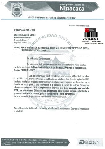 Información de denuncias ambientales del año 2020 presentadas ante la municipalidad de Ninacaca
