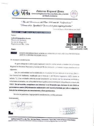 Información de denuncias ambientales del año 2020 presentadas ante el Gobierno Regional Pasco