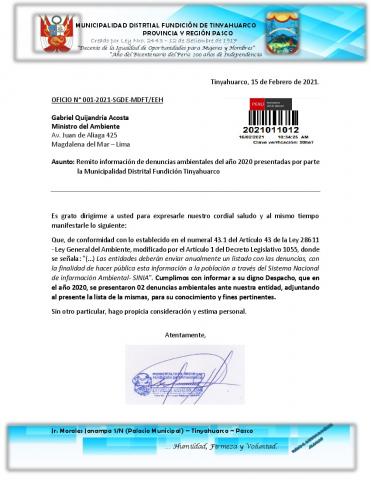 Información de denuncias ambientales del año 2020 presentadas por parte de la Municipalidad Distrital Fundición Tinyahuarco
