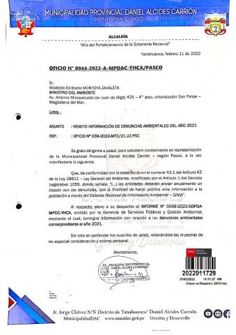 Información de denuncias ambientales del año 2021 de la Municipalidad Provincial Daniel Alcides Carrión