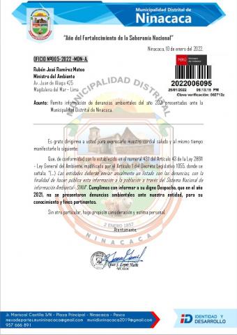 Información de denuncias ambientales del año 2021 presentadas ante la Municipalidad Distrital de Ninacaca
