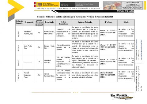 Información de denuncias ambientales del año 2021 presentadas ante la Municipalidad Provincial de Pasco