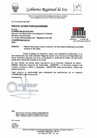 Información sobre denuncias ambientales atendidas en el 2020 del Gobierno Regional de Ica