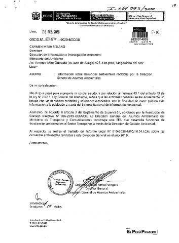 información sobre denuncias ambientales recibidas por la Dirección General de Asuntos Ambientales del Ministerio de Trasportes en el Año 2019