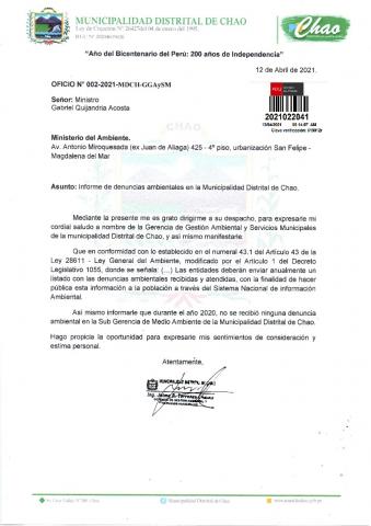 Informe de denuncias ambientales del 2020 de la Municipalidad Distrital de Chao