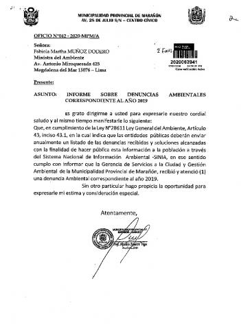 Informe sobre denuncias ambientales año 2019 Municipalidad Provincial de Marañon
