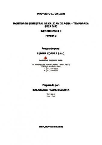 El presente informe muestra los resultados de la ronda de monitoreo semestral de calidad de aguas correspondiente a la temporada seca 2020. Las áreas de trabajo incluyeron la quebrada Chanche y la quebrada Quengomayo. Los resultados de los análisis se presentan en el Anexo A, mientras que el Anexo B presenta la memoria fotográfica.