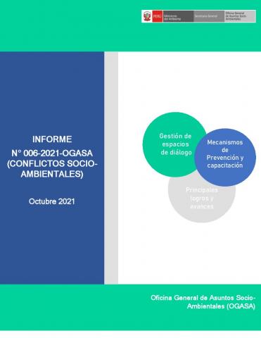 El presente informe desarrolla los avances en la prevención y gestión de la conflictividad socio ambiental del MINAM al mes de octubre de 2021. En la primera parte, se informa sobre la dinámica de la conflictividad social, con mayor intensidad en la Amazonía y la zona sur del país. La participación del ministro del Ambiente, en sesiones presenciales de los espacios de diálogo de Chumbivilcas y Espinar (Cusco) y Ocuviri (Puno), y se informa de la creación de nuevos espacios de diálogo en Apurímac y Puno. En la segunda parte, se desarrollan las acciones preventivas y de fortalecimiento de capacidades. En la tercera parte se plantean algunos logros y finalmente se registran las principales conclusiones.