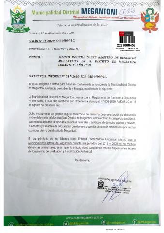 Informe sobre registro de denuncias ambientales en el Distrito de Megantoni durante el año 2020