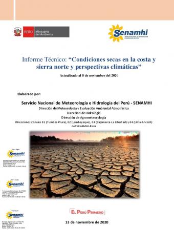 El presente Informe Técnico es una actualización del reporte "Condiciones secas en costa y sierra norte del Perú (enero-agosto 2020) y perspectivas hasta el verano 2021”, el cual evidenciaba las condiciones deficitarias en las cuencas del Pacífico Norte del Perú y volúmenes de agua almacenada en los reservorios, así como el análisis agrometeorológico del impacto asociado durante la campaña agrícola 2019- 2020.