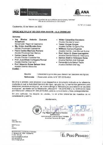La Autoridad Nacional del Agua aprueba los “Lineamientos generales para determinar caudales ecológicos”, asi mismo deroga la “Metodología para determinar caudales ecológicos”, aprobada con la Resolución Jefatural N° 154-2016-ANA y su rectificación dada por Resolución Jefatural N° 206-2016-ANA.