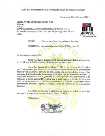 Información sobre denuncias ambientales de la Municipalidad Distrital de Sabandía