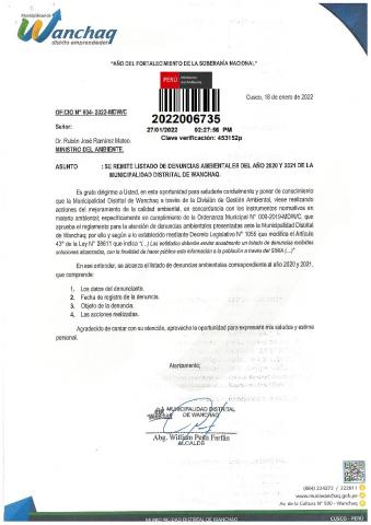 LISTADO DE DENUNCIAS AMBIENTALES CORRESPONDIENTES AL AÑO 2020 Y 2021 DE LA MUNICIPALIDAD DISTRITAL DE WANCHAQ