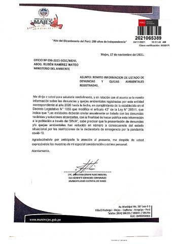 Listado de denuncias ambientales de la Municipalidad Distrital de Majes correspondiente al año 2020 2021