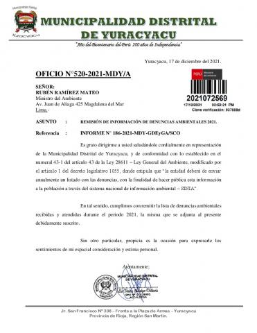 La Municipalidad Distrital de Yuracyacu remite al Ministerio del Ambiente información sobre las denuncias y quejas ambientales registradas por esta entidad correspondiente al año 2021, en cumplimiento de lo establecido en el Decreto Legislativo N° 1055 que modifica el artículo 43° de la Ley N° 28611, que indica que "Las entidades deberán enviar anualmente un listado con las denuncias recibidas y soluciones alcanzadas, con la finalidad de hacer pública esta información a la población a través del SINIA".