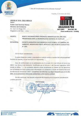 La Municipalidad Distrital de Huayllay-Pasco remite al Ministerio del Ambiente información sobre las denuncias ambientales registradas por esta entidad correspondiente al año 2021, en cumplimiento de lo establecido en el Decreto Legislativo N° 1055 que modifica el artículo 43° de la Ley N° 28611, que indica que "Las entidades deberán enviar anualmente un listado con las denuncias recibidas y soluciones alcanzadas, con la finalidad de hacer pública esta información a la población a través del SINIA". Este municipio señala que durante el citado periodo no se registraron denuncias ambientales.