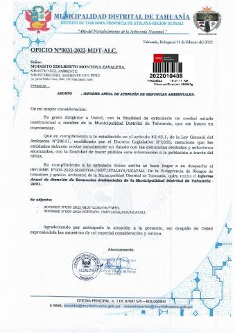 La Municipalidad distrital de Tahuanía remite al Ministerio del Ambiente información sobre las denuncias ambientales registradas por esta entidad correspondiente al año 2021, en cumplimiento de lo establecido en el Decreto Legislativo N° 1055 que modifica el artículo 43° de la Ley N° 28611, que indica que "Las entidades deberán enviar anualmente un listado con las denuncias recibidas y soluciones alcanzadas, con la finalidad de hacer pública esta información a la población a través del SINIA".