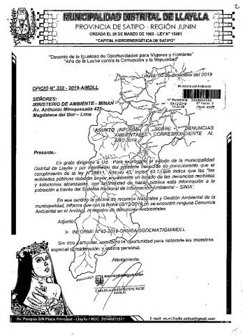 La Municipalidad Distrital de Llaylla remite al Ministerio del Ambiente información sobre las denuncias ambientales registradas por esta entidad correspondiente al año 2019, en cumplimiento de lo establecido en el Decreto Legislativo N° 1055 que modifica el artículo 43° de la Ley N° 28611, que indica que "Las entidades deberán enviar anualmente un listado con las denuncias recibidas y soluciones alcanzadas, con la finalidad de hacer pública esta información a la población a través del SINIA".