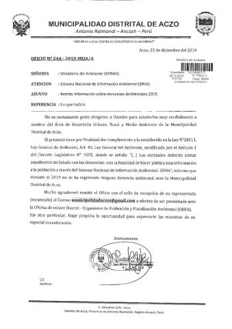 La Municipalidad Distrital de Aczo remite al Ministerio del Ambiente información sobre las denuncias ambientales registradas por esta entidad correspondiente al año 2019, en cumplimiento de lo establecido en el Decreto Legislativo N° 1055 que modifica el artículo 43° de la Ley N° 28611, que indica que "Las entidades deberán enviar anualmente un listado con las denuncias recibidas y soluciones alcanzadas, con la finalidad de hacer pública esta información a la población a través del SINIA".