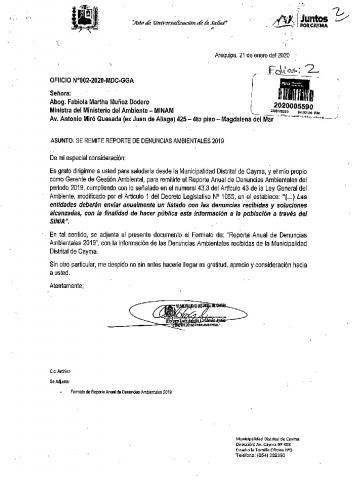 La Municipalidad Distrital de Cayma remite al Ministerio del Ambiente información sobre las denuncias ambientales registradas por esta entidad correspondiente al año 2019, en cumplimiento de lo establecido en el Decreto Legislativo N° 1055 que modifica el artículo 43° de la Ley N° 28611, que indica que "Las entidades deberán enviar anualmente un listado con las denuncias recibidas y soluciones alcanzadas, con la finalidad de hacer pública esta información a la población a través del SINIA".