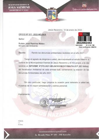 La Municipalidad Distrital de Jesús Nazareno remite al Ministerio del Ambiente información sobre las denuncias ambientales registradas por esta entidad correspondiente al año 2021, en cumplimiento de lo establecido en el Decreto Legislativo N° 1055 que modifica el artículo 43° de la Ley N° 28611, que indica que "Las entidades deberán enviar anualmente un listado con las denuncias recibidas y soluciones alcanzadas, con la finalidad de hacer pública esta información a la población a través del SINIA".