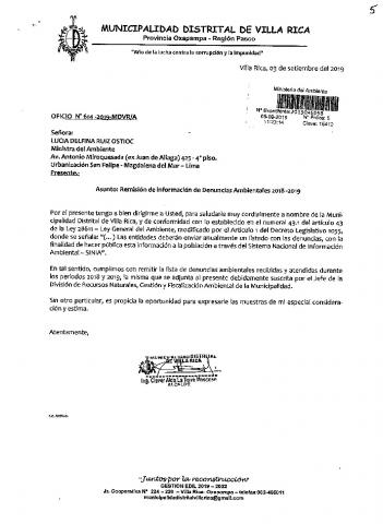 La Municipalidad Distrital de Villa Rica remite al Ministerio del Ambiente información sobre las denuncias ambientales registradas por esta entidad correspondiente a los años 2018 y 2019, en cumplimiento de lo establecido en el Decreto Legislativo N° 1055 que modifica el artículo 43° de la Ley N° 28611, que indica que "Las entidades deberán enviar anualmente un listado con las denuncias recibidas y soluciones alcanzadas, con la finalidad de hacer pública esta información a la población a través del SINIA."