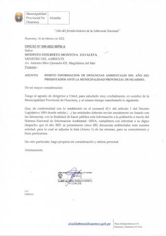 La Municipalidad provincial de Huarmey remite al Ministerio del Ambiente información sobre las denuncias ambientales registradas por esta entidad correspondiente al año 2021, en cumplimiento de lo establecido en el Decreto Legislativo N° 1055 que modifica el artículo 43° de la Ley N° 28611, que indica que "Las entidades deberán enviar anualmente un listado con las denuncias recibidas y soluciones alcanzadas, con la finalidad de hacer pública esta información a la población a través del SINIA".
