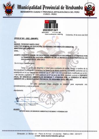 La Municipalidad provincial de Urubamba remite al Ministerio del Ambiente información sobre las denuncias ambientales registradas por esta entidad correspondiente al año 2021, en cumplimiento de lo establecido en el Decreto Legislativo N° 1055 que modifica el artículo 43° de la Ley N° 28611, que indica que "Las entidades deberán enviar anualmente un listado con las denuncias recibidas y soluciones alcanzadas, con la finalidad de hacer pública esta información a la población a través del SINIA".