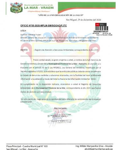 Registro de atención de denuncias del 2020 de la Municipalidad Provincial de La Mar