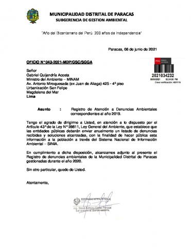 Denuncias ambientales presentadas durante el año Fiscal 2020 de la Municipalidad DISTRITAL de los Aquijes