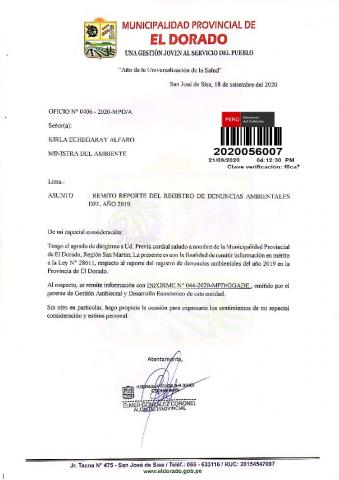 Registro de denuncias ambientales del año 2019 de la Municipalidad provincial EL Dorado